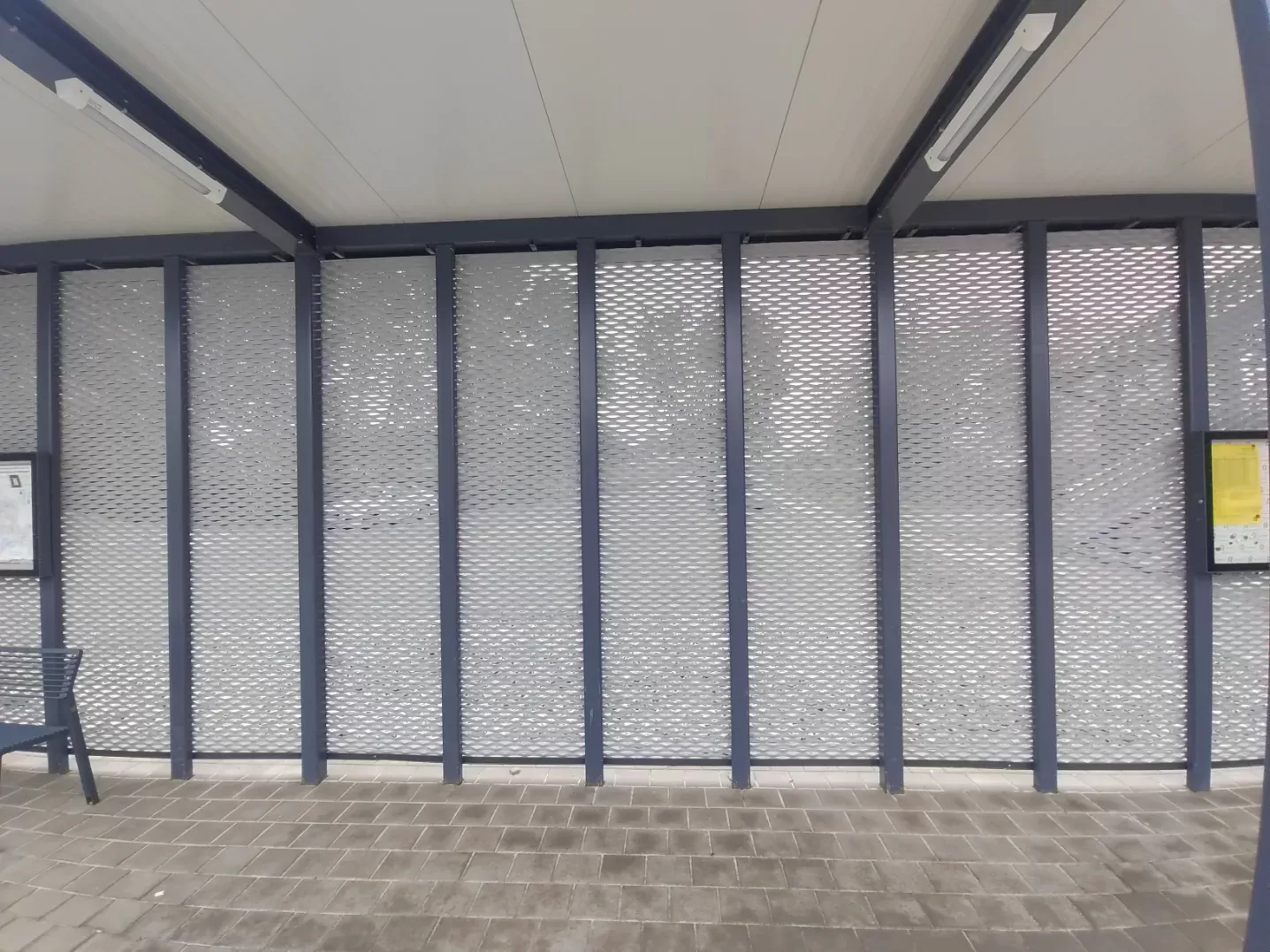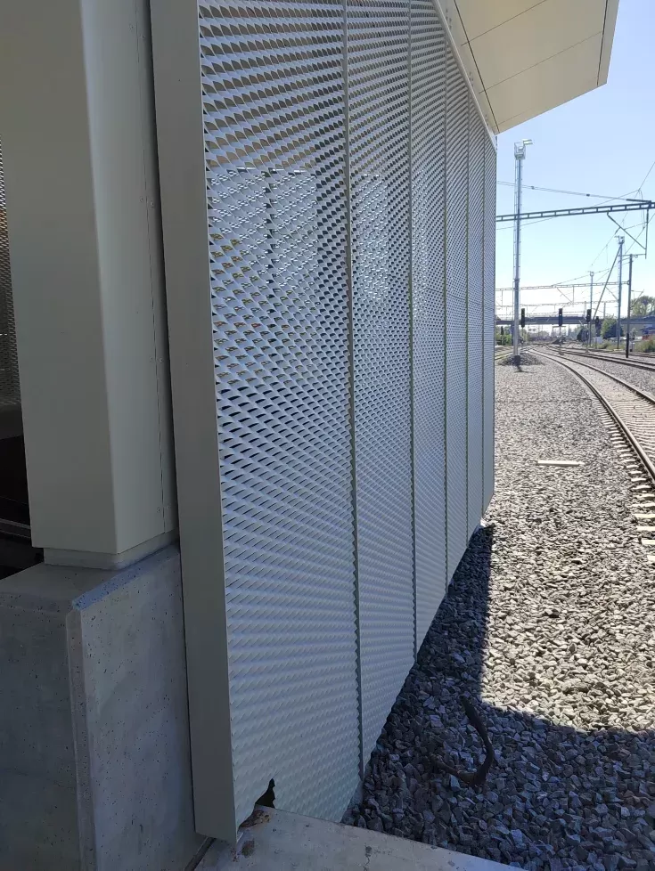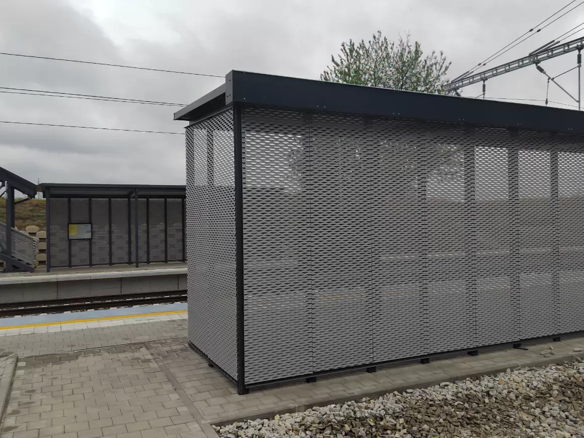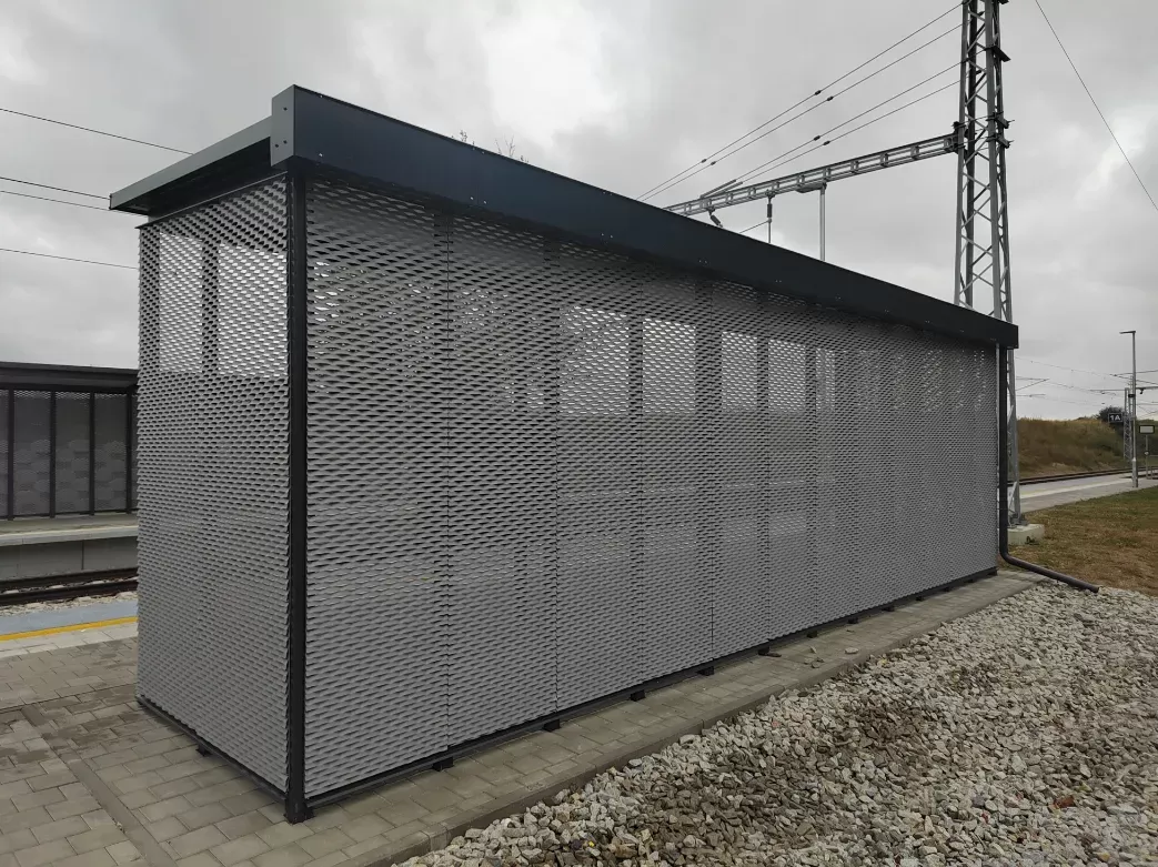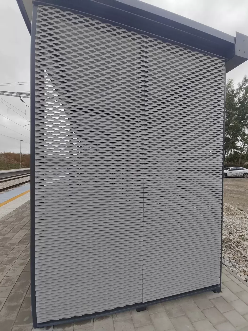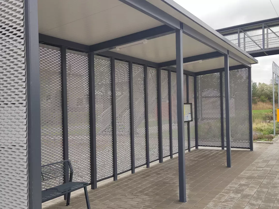 Použití: Opláštění zastávky tahokovem | Typ: Tahokov oko kosočtvercové 115x45 mm / můstek 20 mm | Materiál: Hliník 1,5mm | Povrchová úprava: Práškové lakování RAL 7032 a RAL 9002