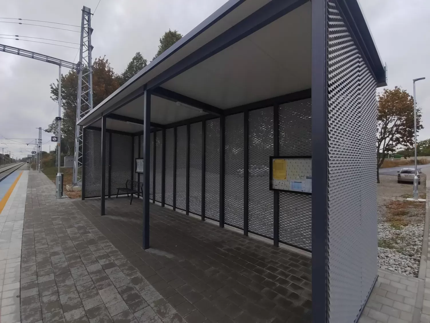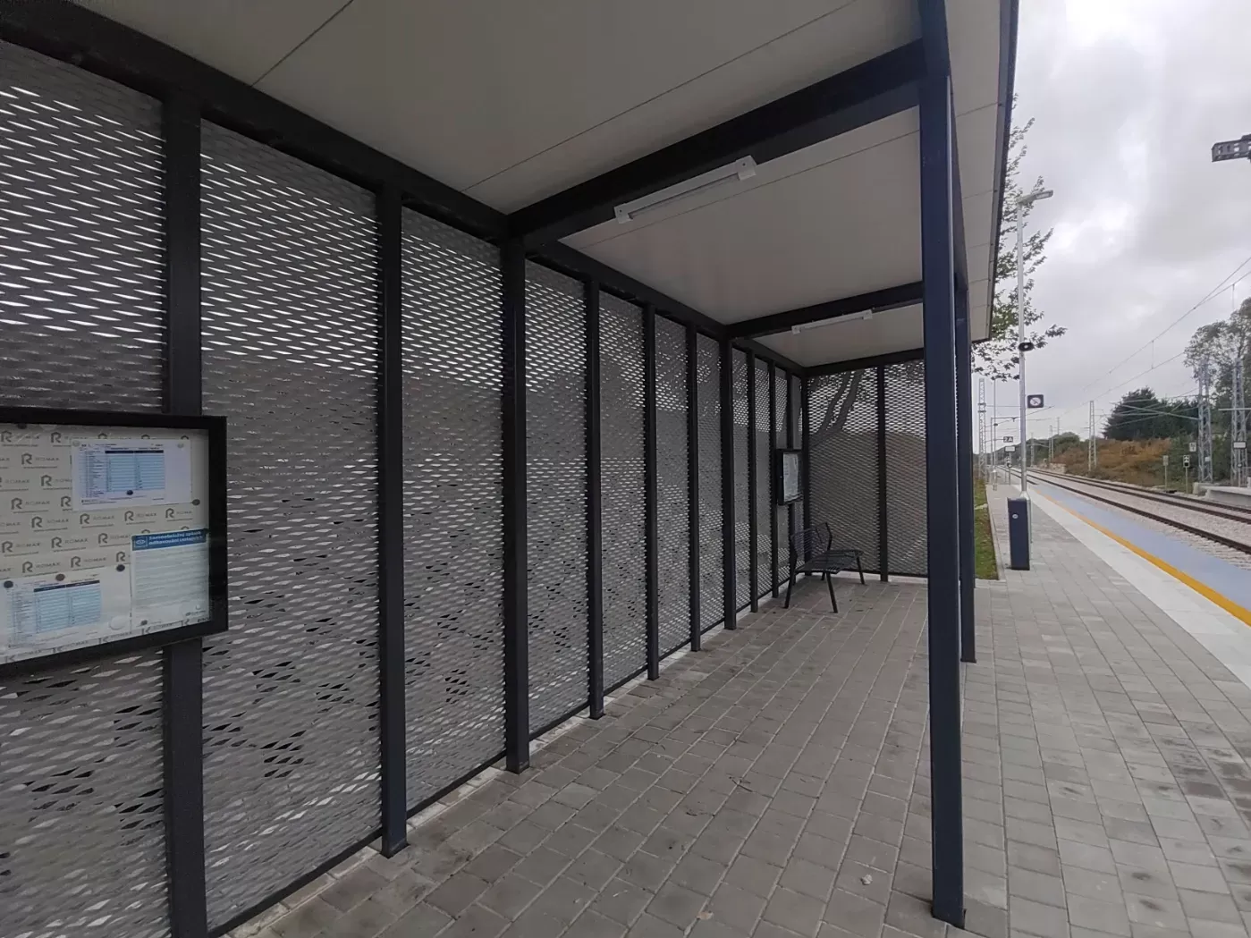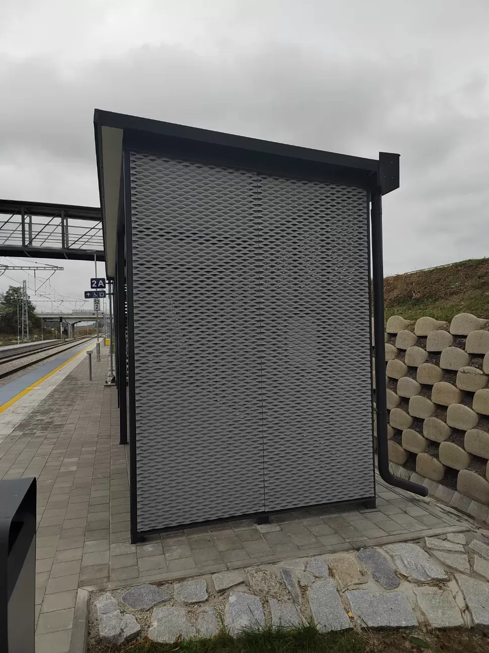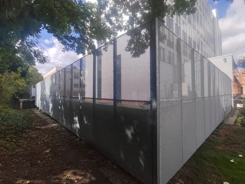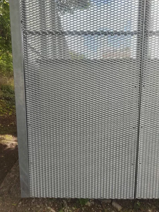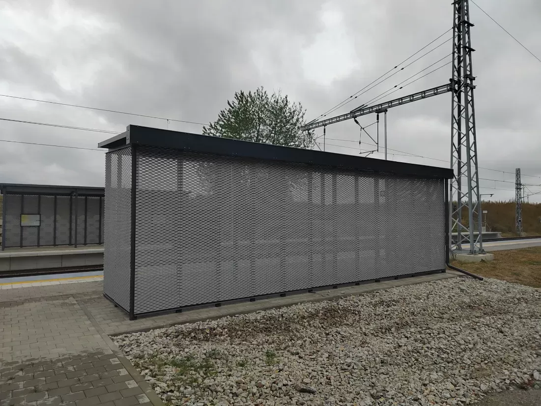 Použití: Opláštění zastávky tahokovem | Typ: Tahokov oko kosočtvercové 115x45 mm / můstek 20 mm | Materiál: Hliník 1,5mm | Povrchová úprava: Práškové lakování RAL 7032 a RAL 9002