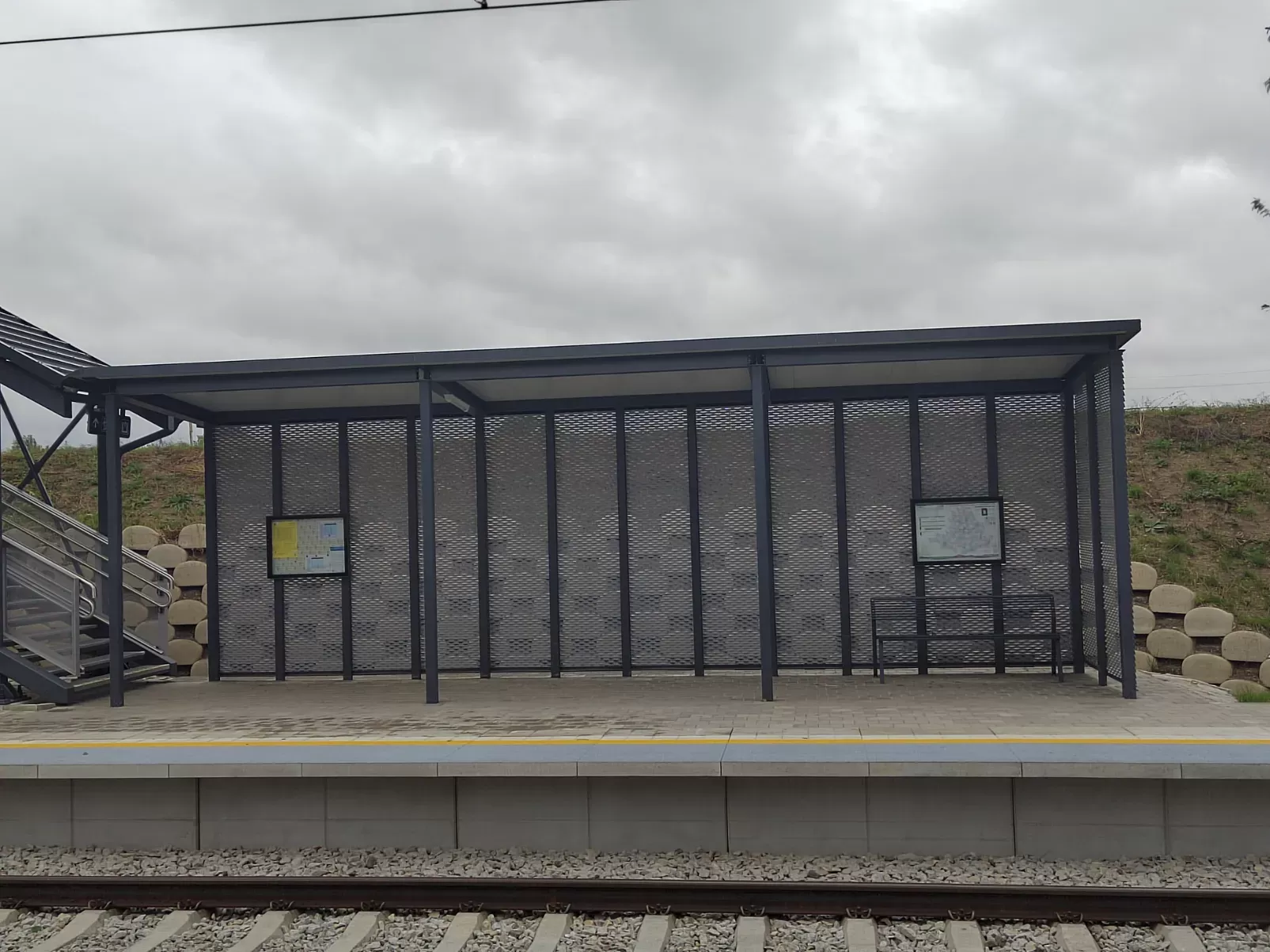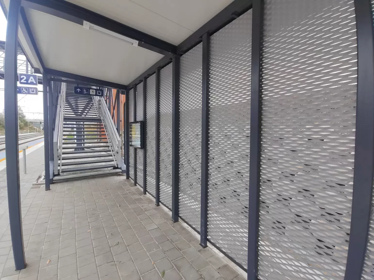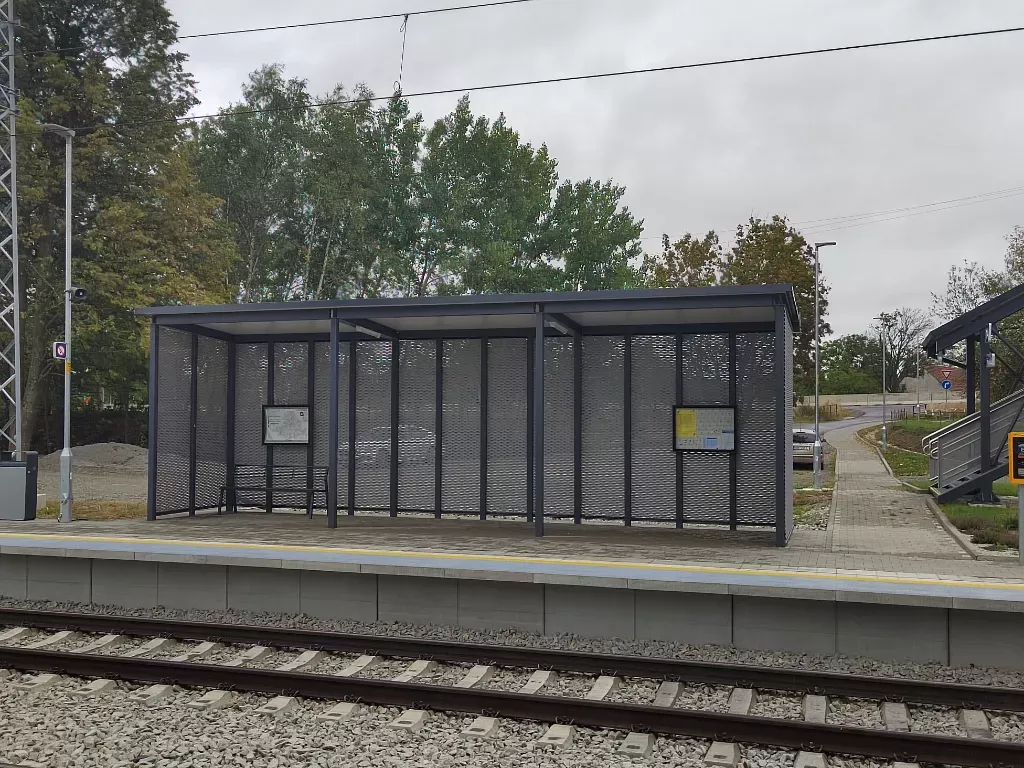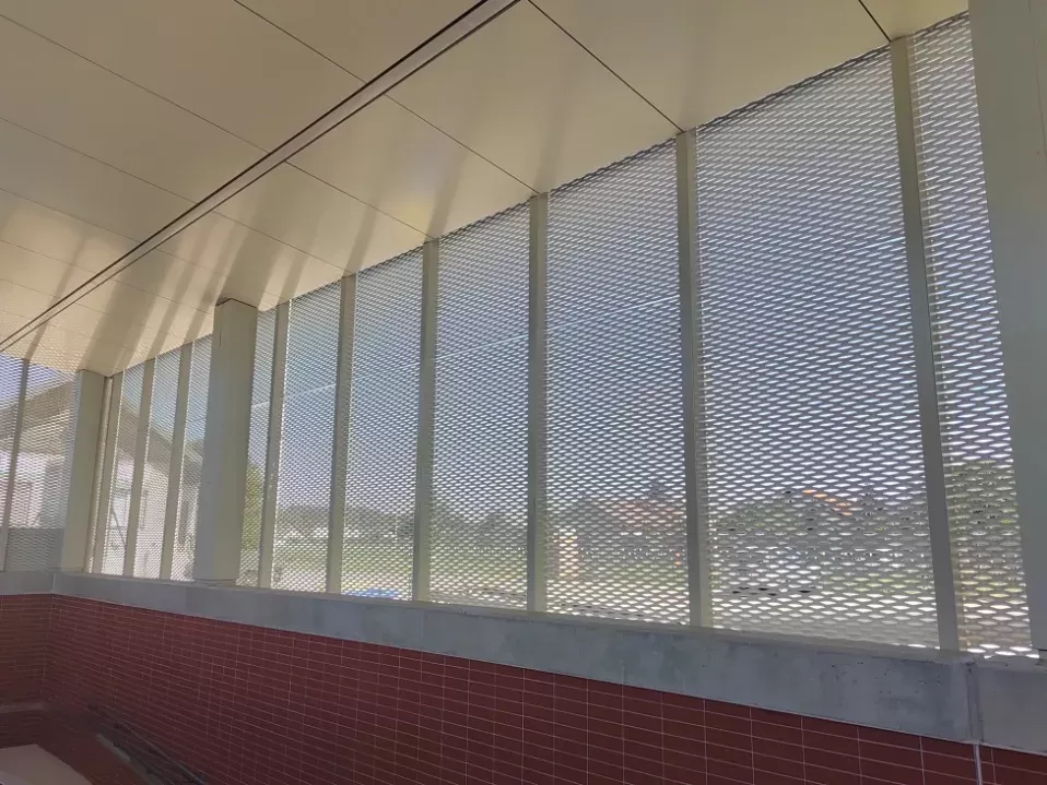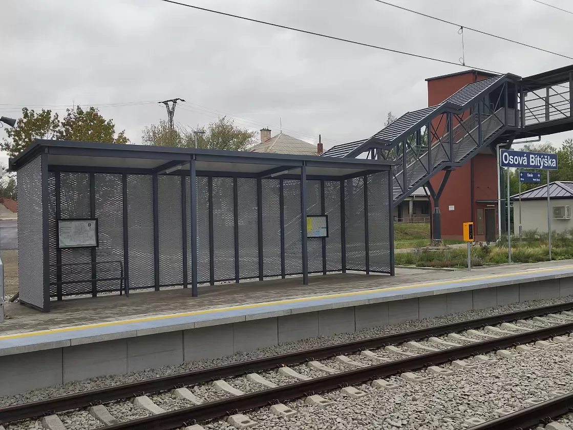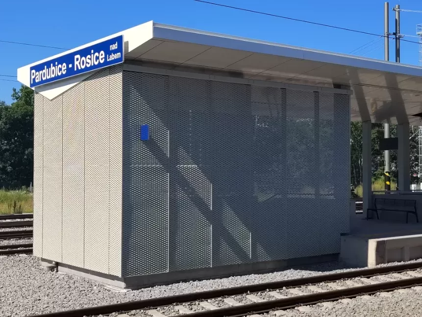 Použití: Opláštění zastávky tahokovem | Typ: Tahokov oko kosočtvercové 115x45 mm / můstek 20 mm | Materiál: Hliník 1,5mm | Povrchová úprava: Práškové lakování RAL 7032 a RAL 9002
