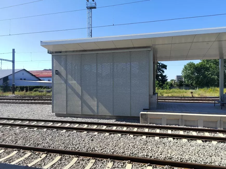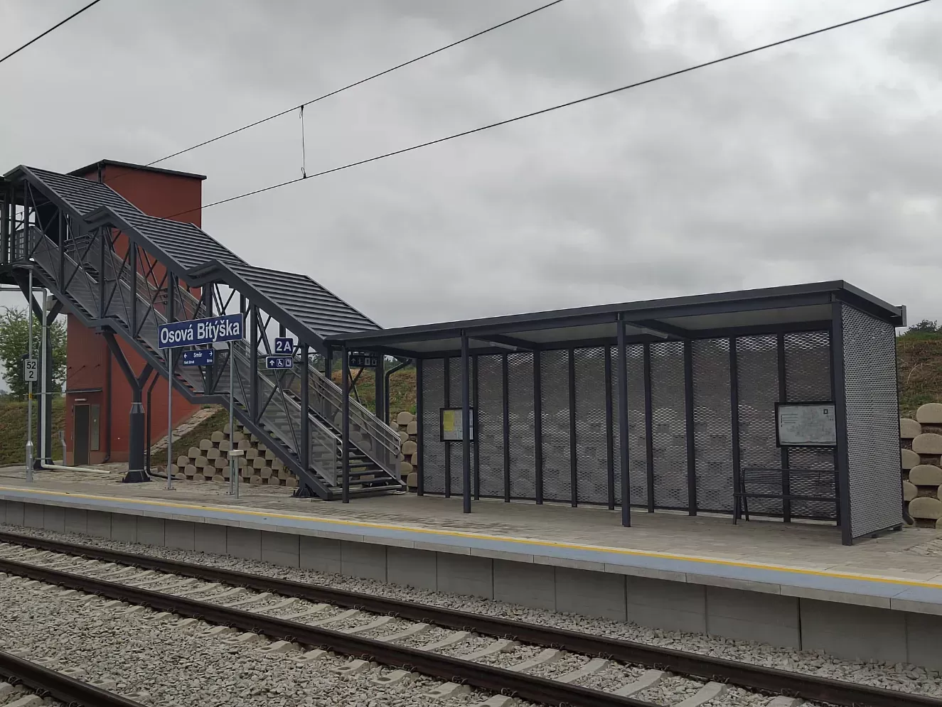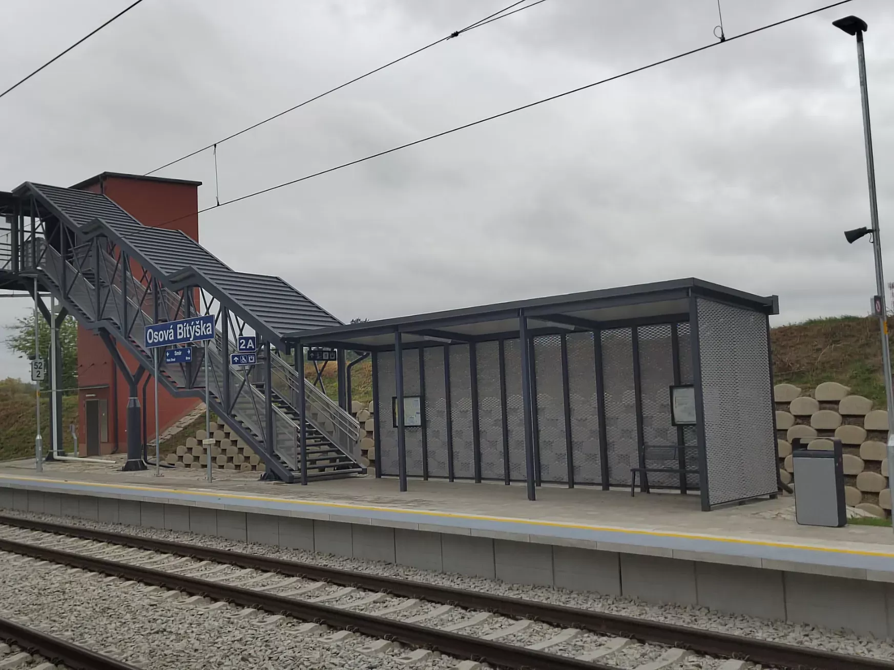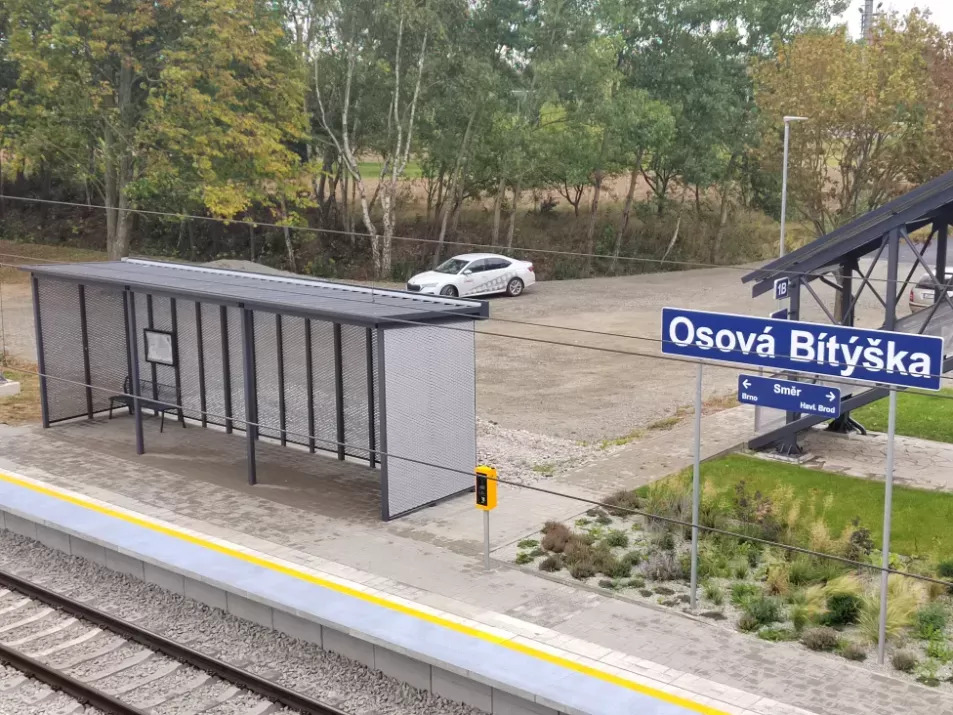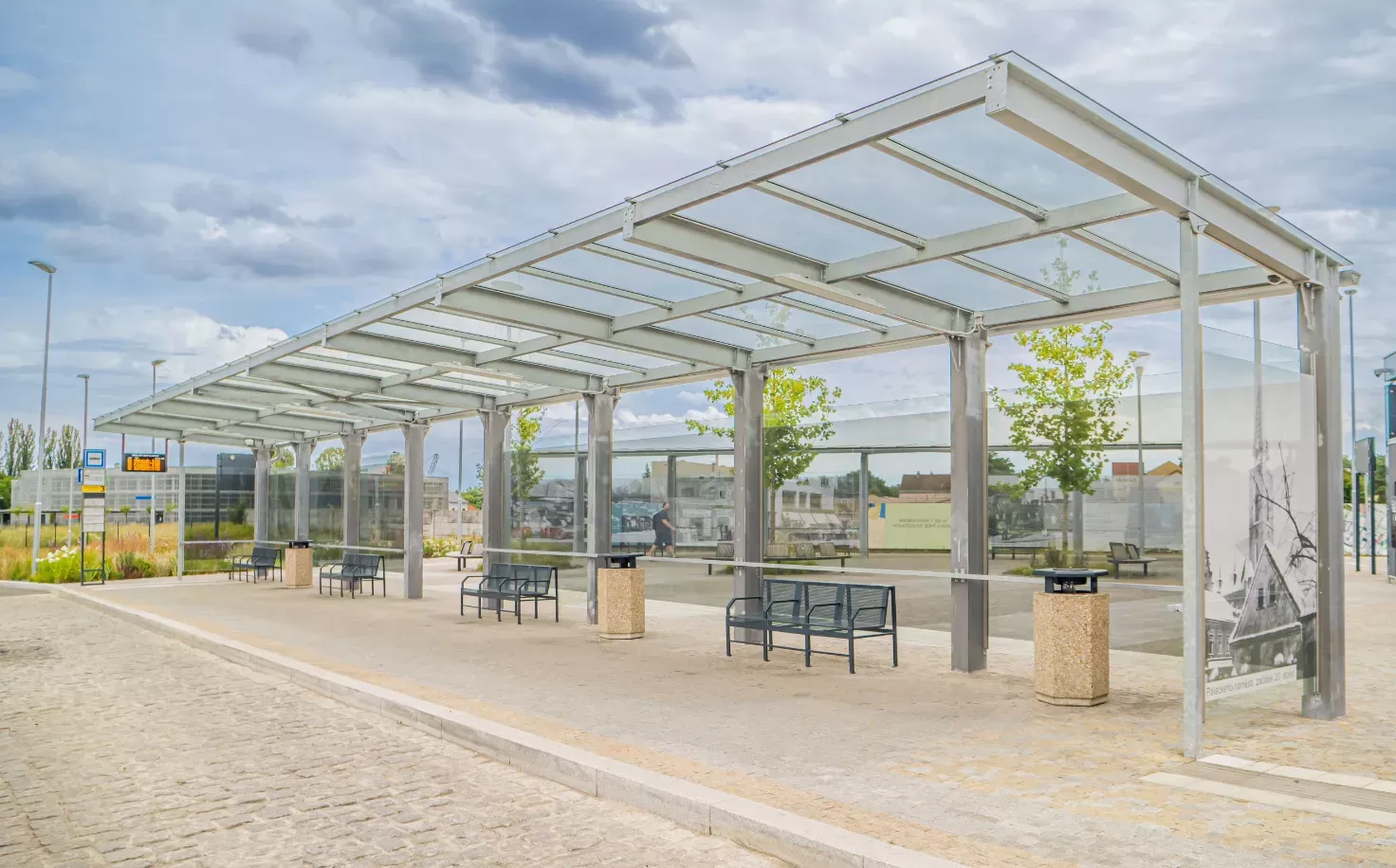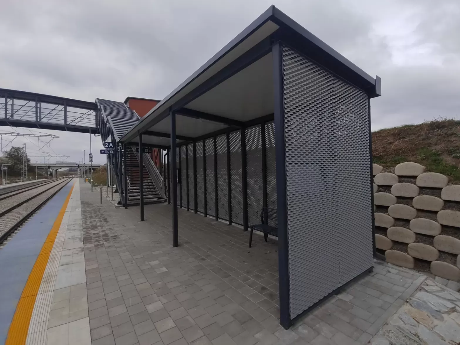 Použití: Opláštění zastávky tahokovem | Typ: Tahokov oko kosočtvercové 115x45 mm / můstek 20 mm | Materiál: Hliník 1,5mm | Povrchová úprava: Práškové lakování RAL 7032 a RAL 9002