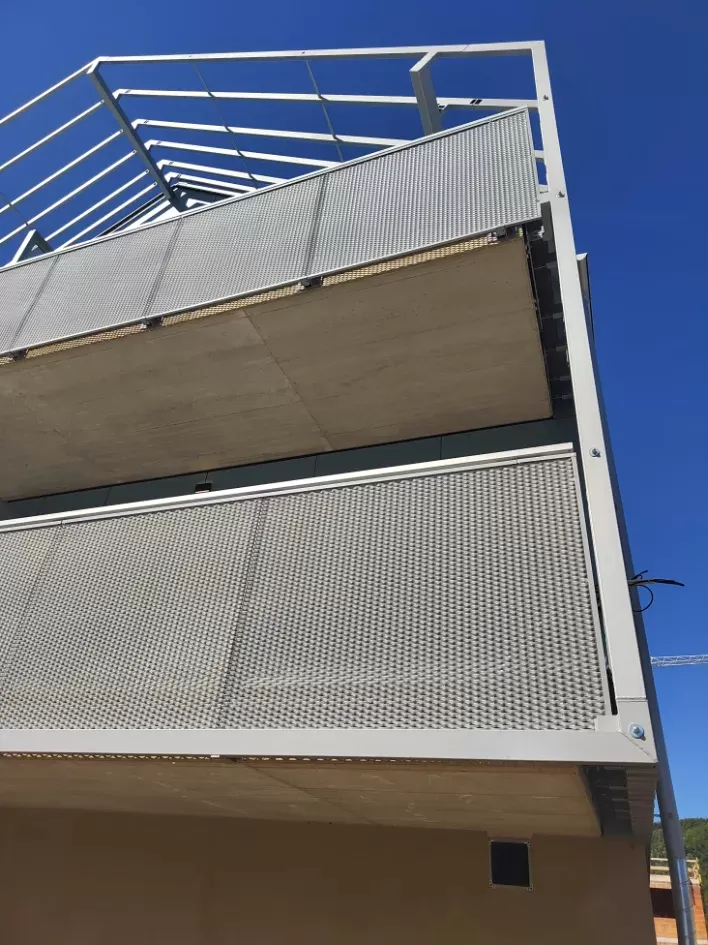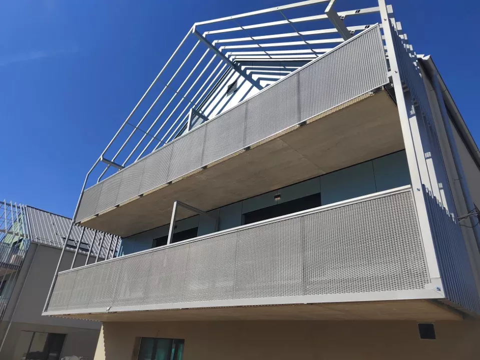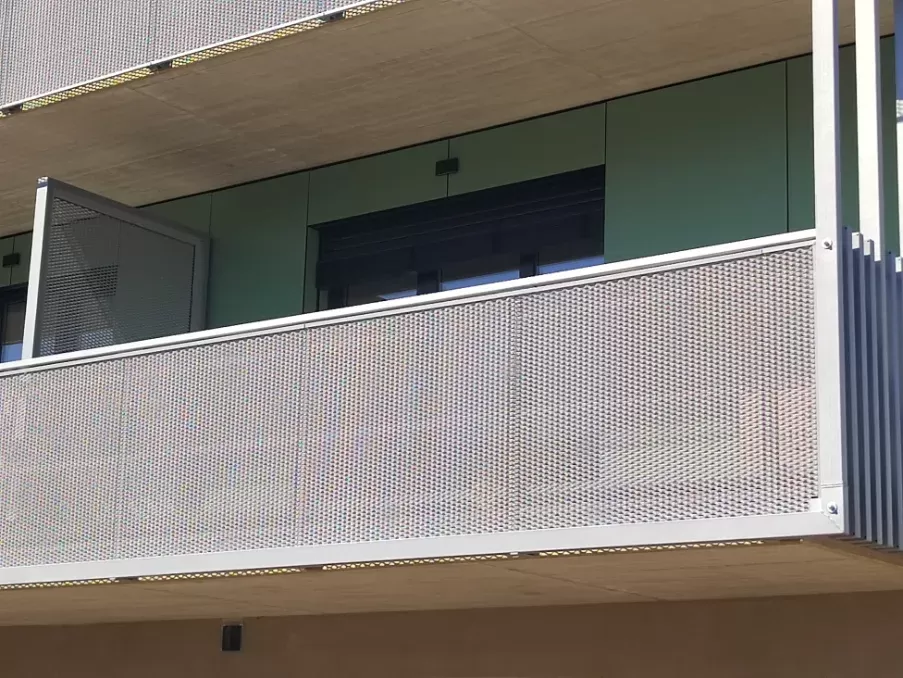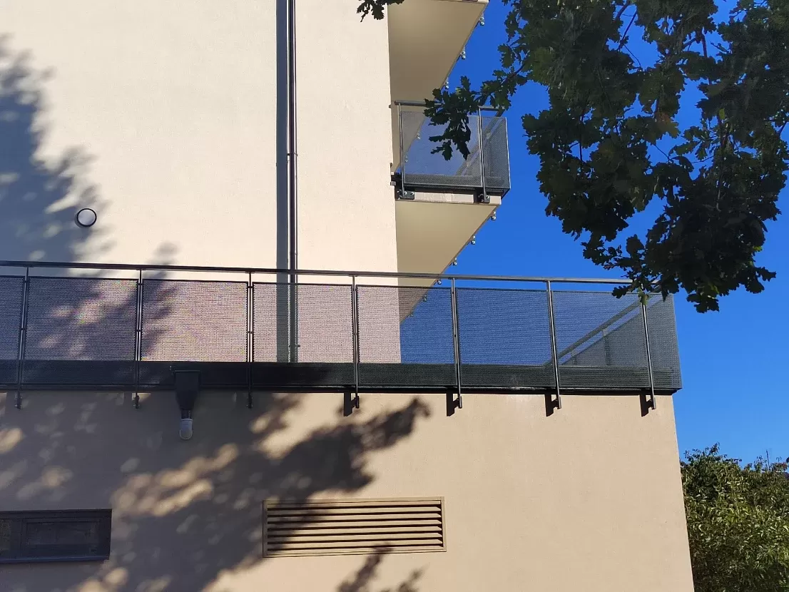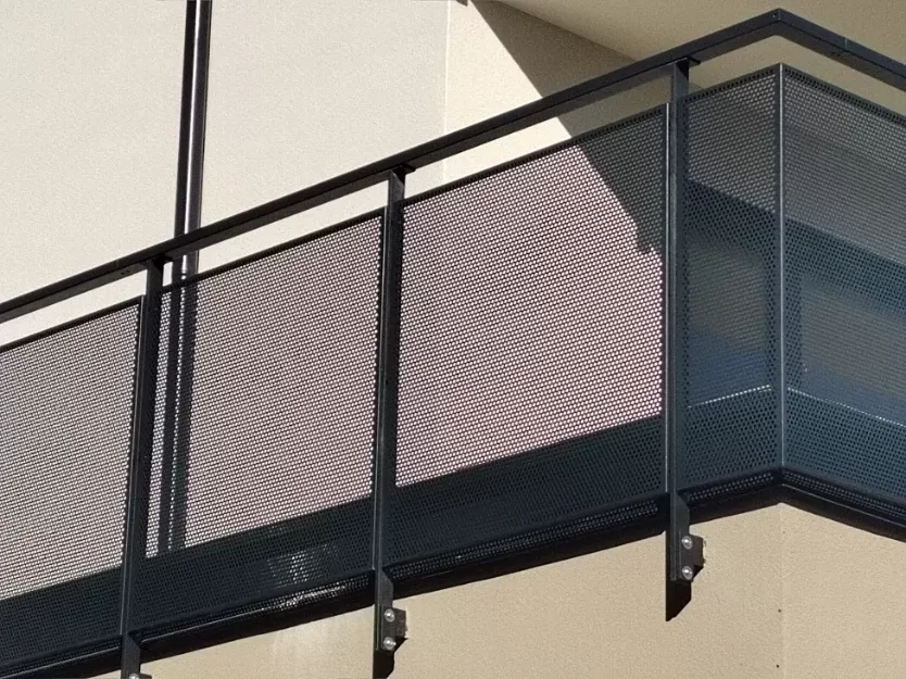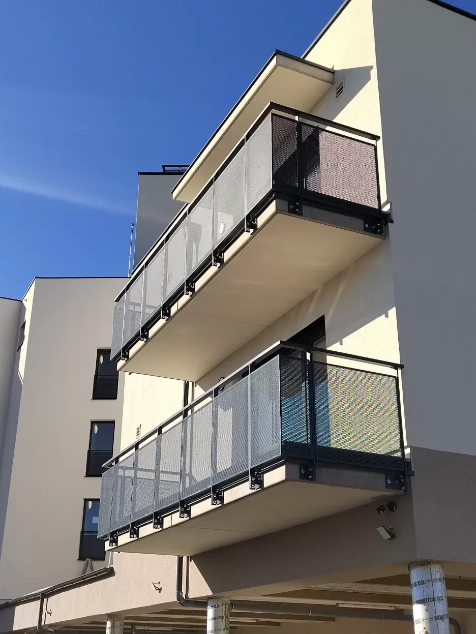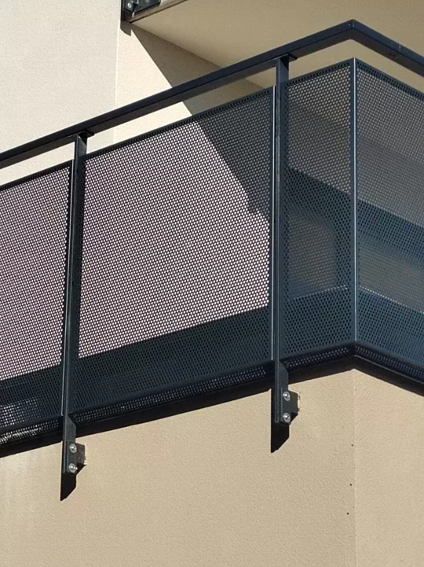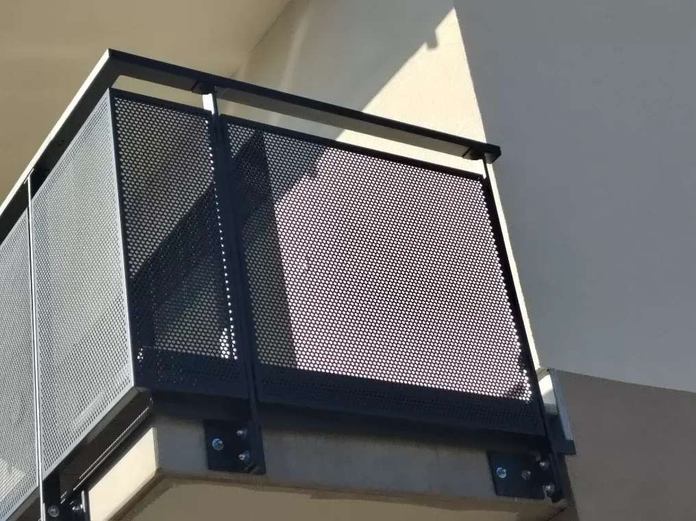 Použití: Výplně balkónů bytového domu | Typ: Děrovaný plech Rv 30-42 | Materiál: Pozinkovaný plech 1,5mm