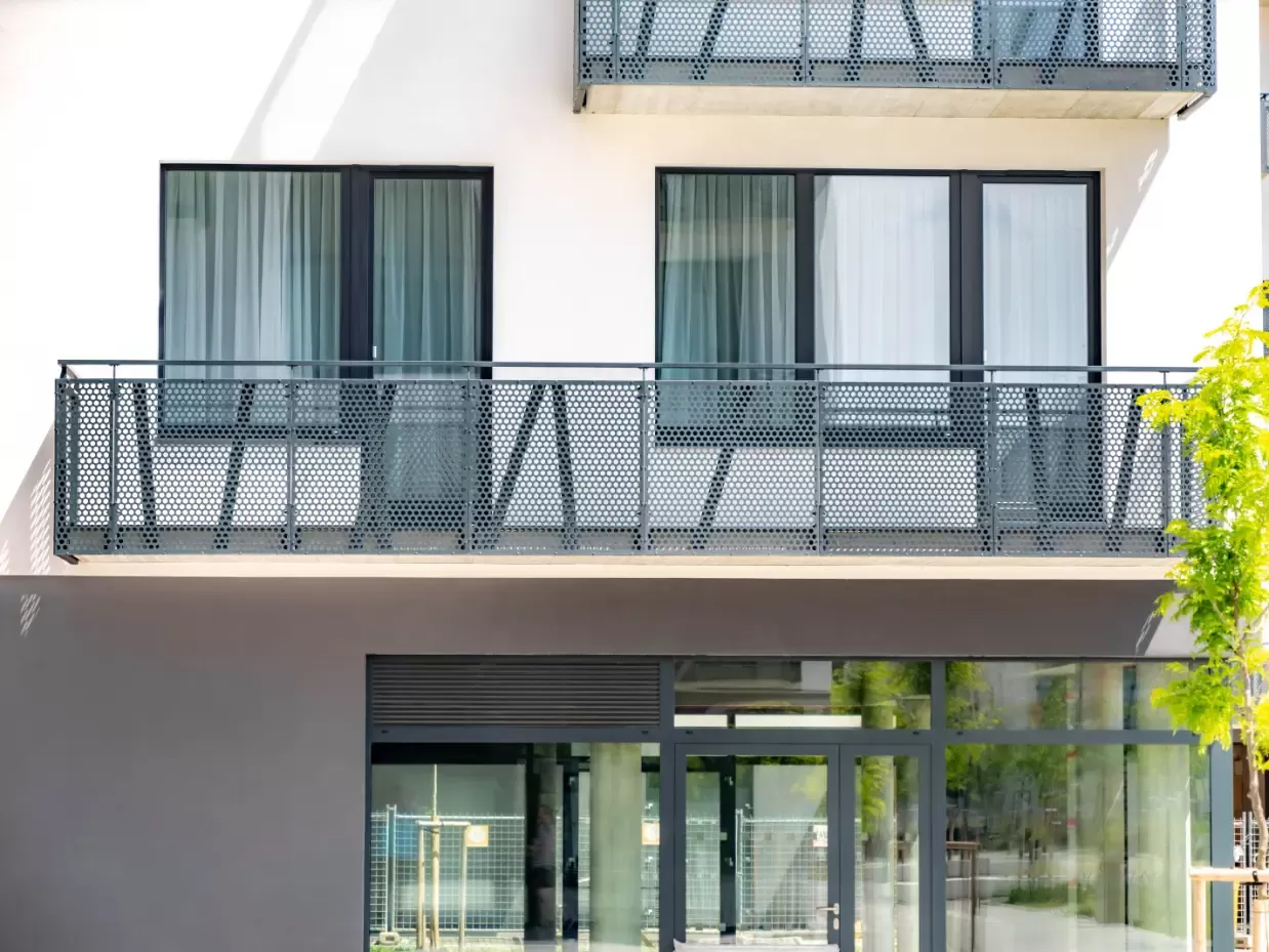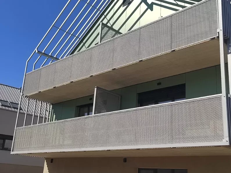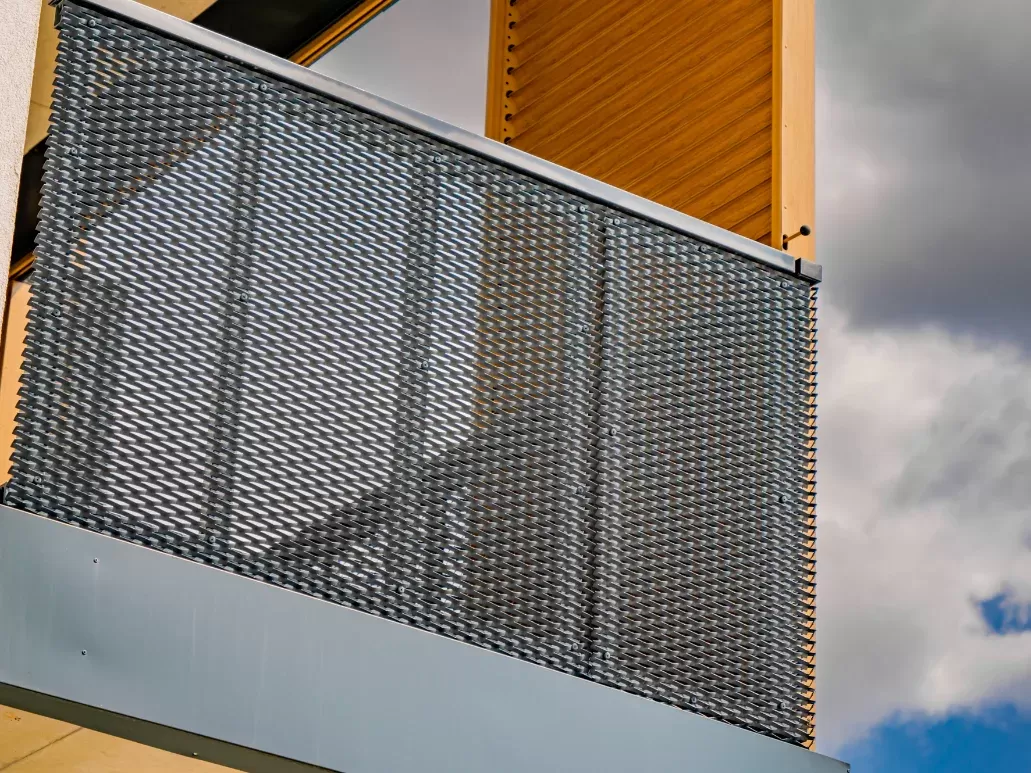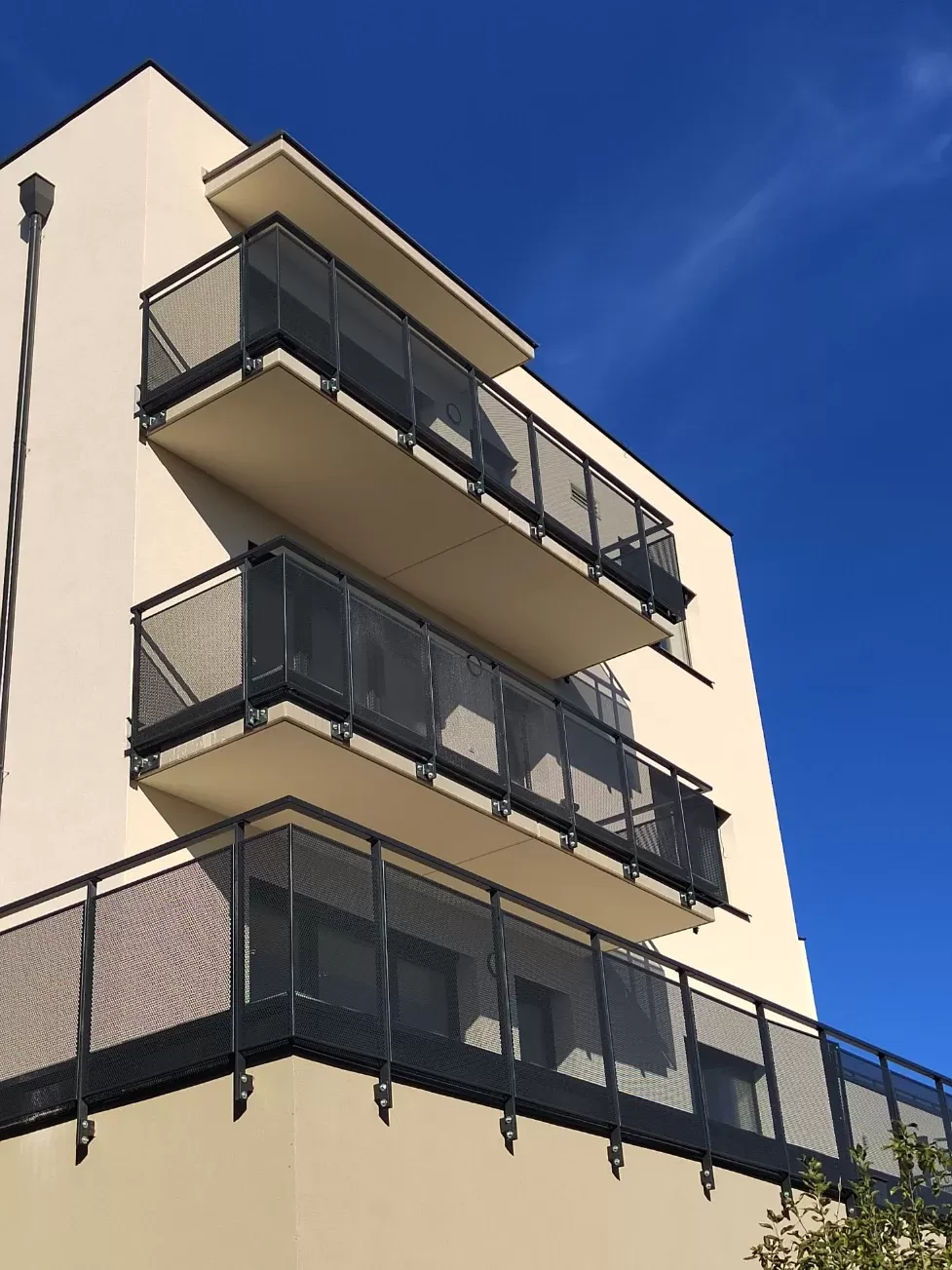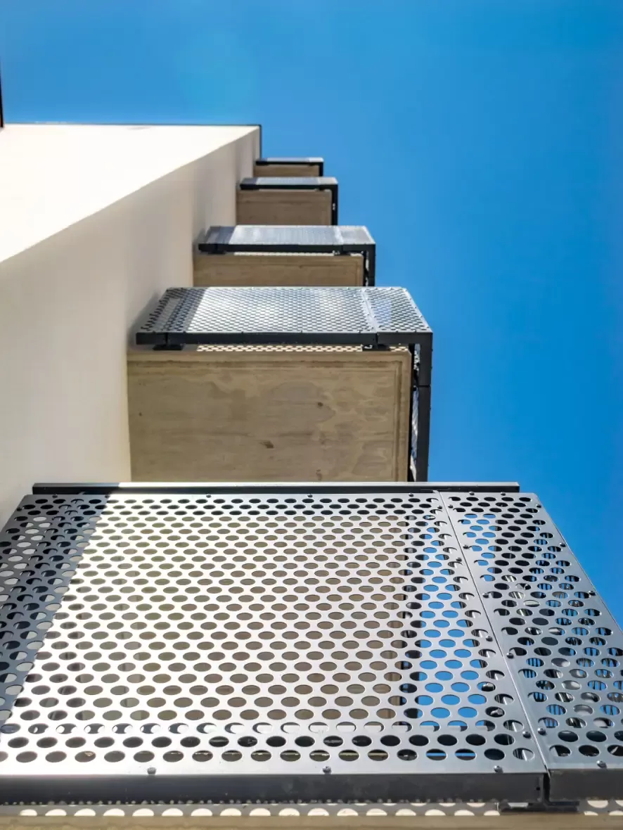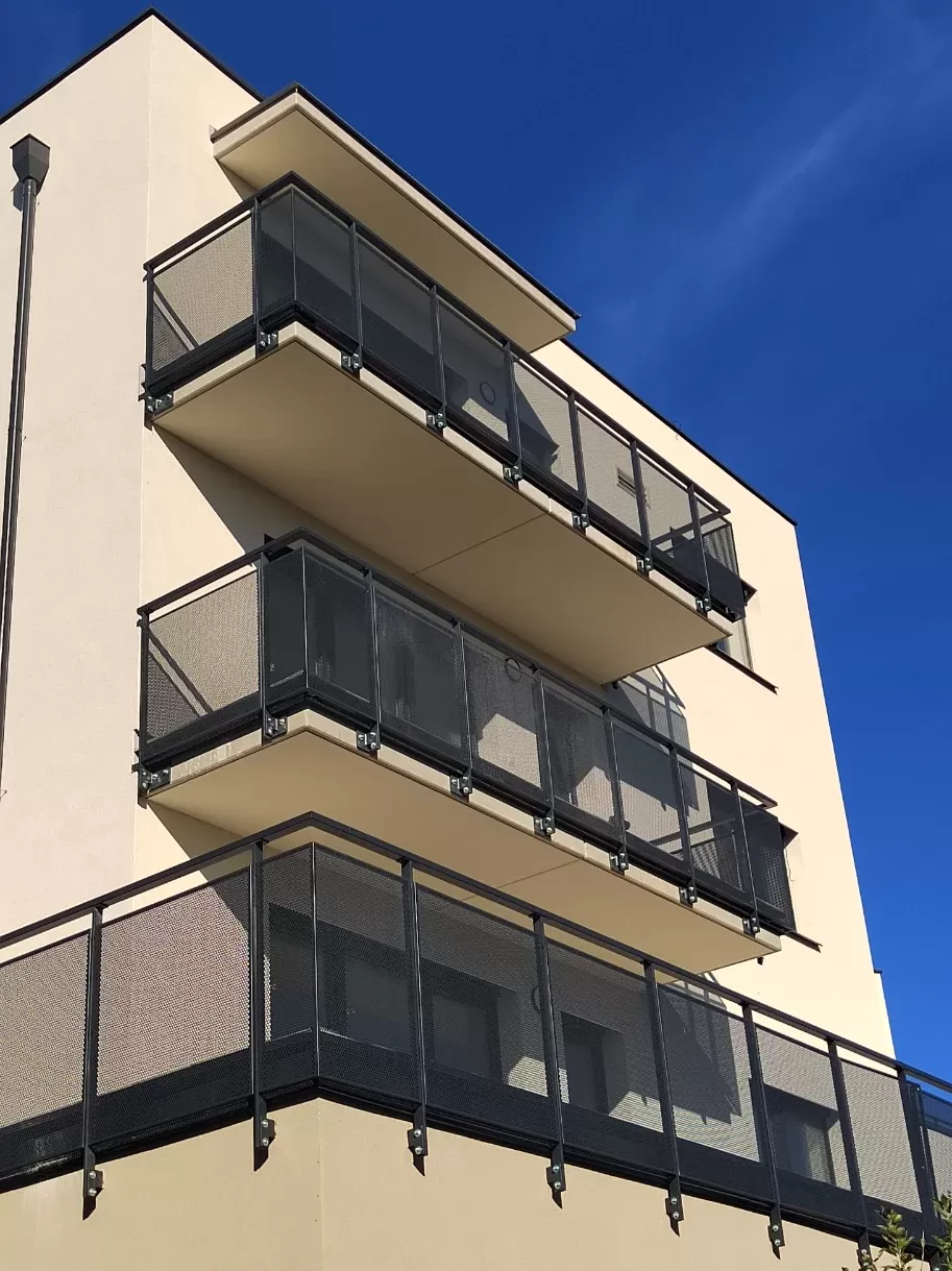 Použití: Výplně balkónů bytového domu | Typ: Děrovaný plech Rv 30-42 | Materiál: Pozinkovaný plech 1,5mm