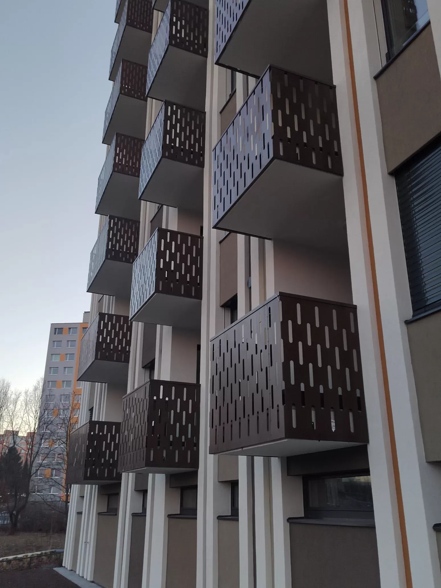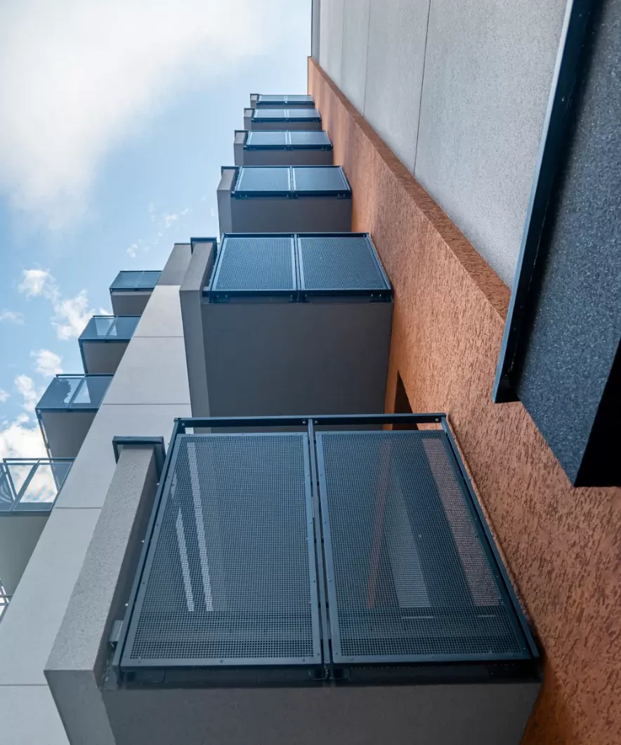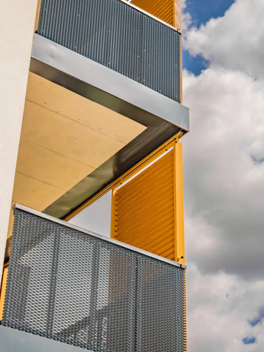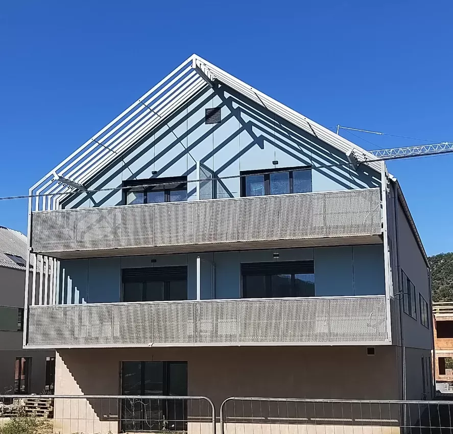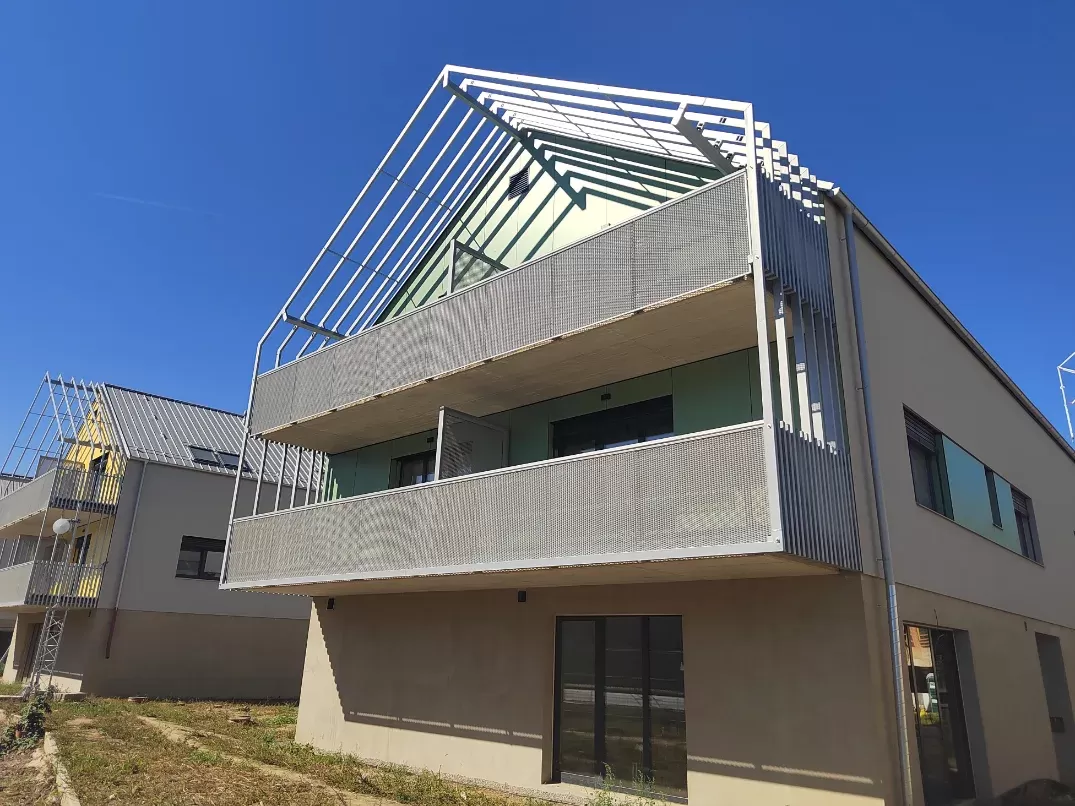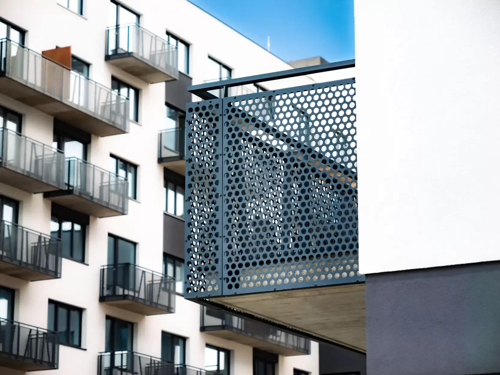 Použití: Výplně balkónů bytového domu | Typ: Děrovaný plech Rv 30-42 | Materiál: Pozinkovaný plech 1,5mm