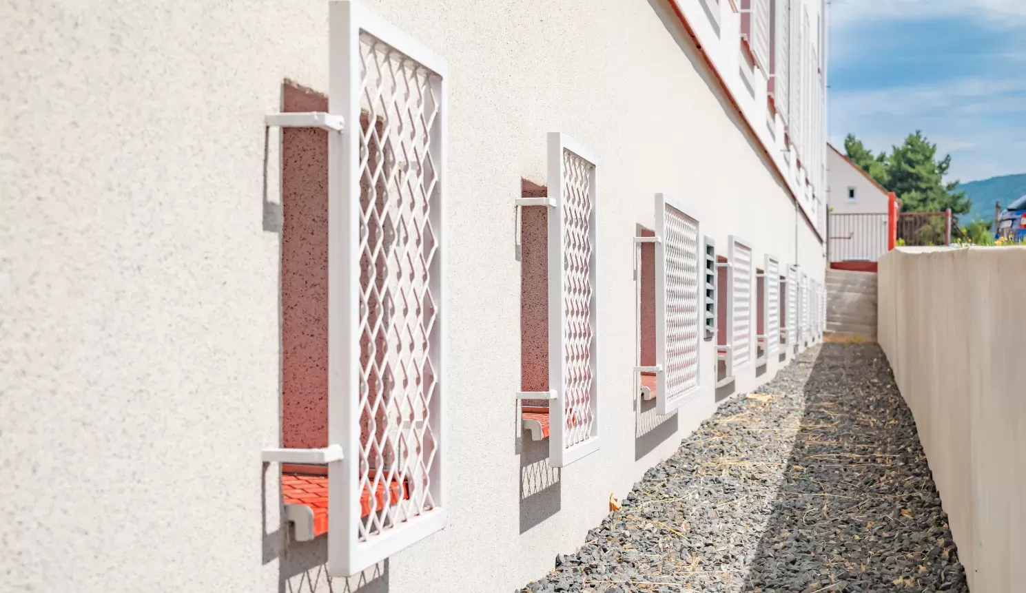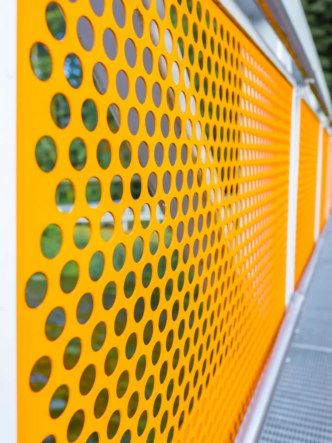 Použití: Výplně balkonů a zástěny | Typ: Speciální děrování - děrovaný půlkruh o průměru 20 mm | Materiál: Ocel 2,0 mm | Povrchová úprava: Práškové lakování RAL 9003 (signální bílá)