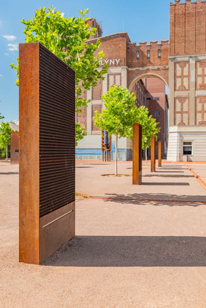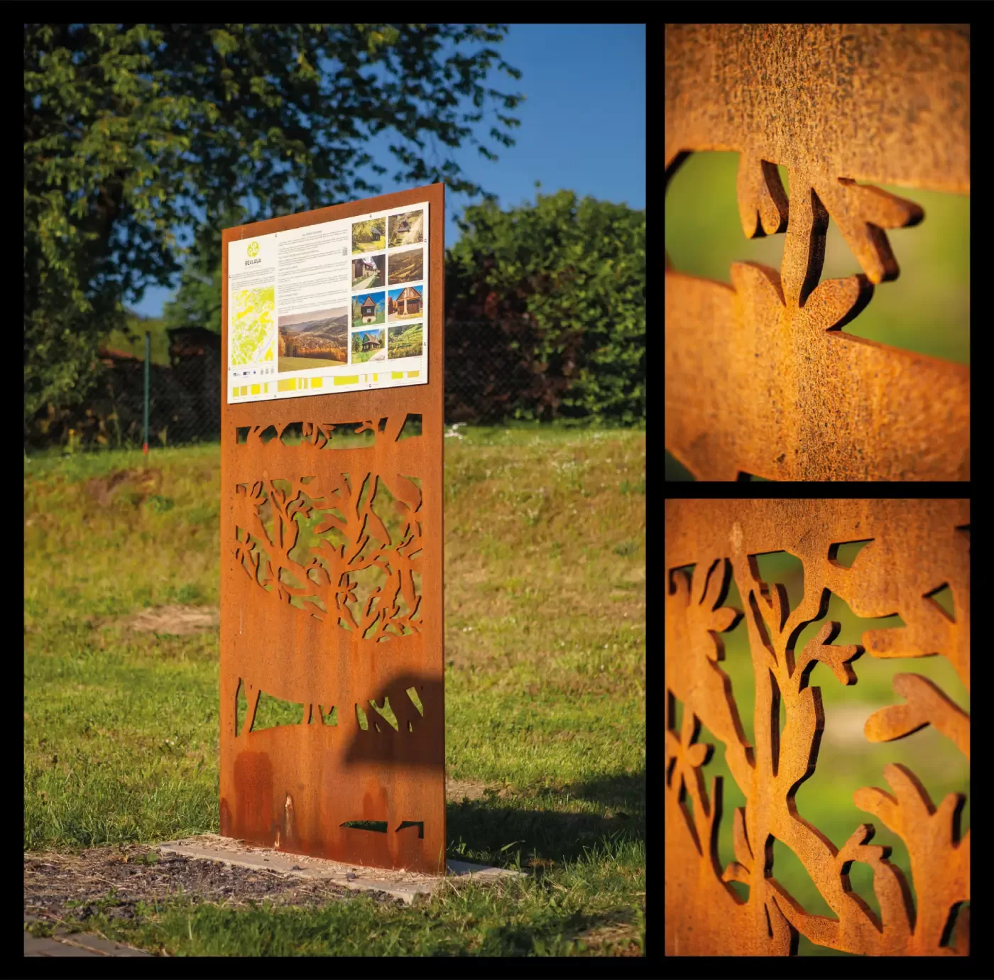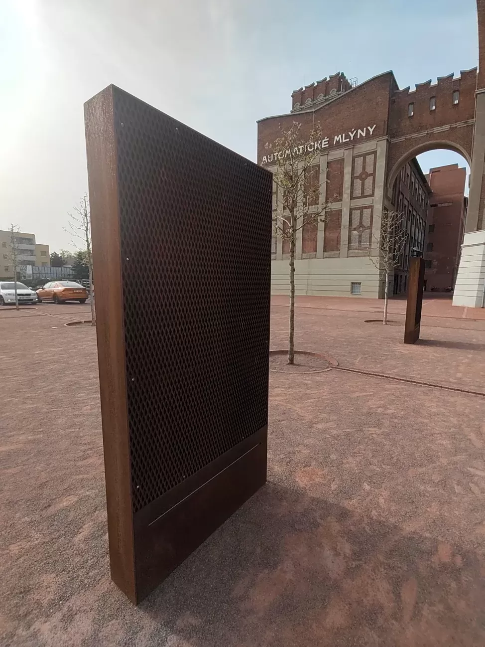 Použití: Designová informační tabule | Typ: Designový výpalek dle výkresu | Materiál: Corten | Autor díla: Studio Dezainers | Foto: Jan Zainer