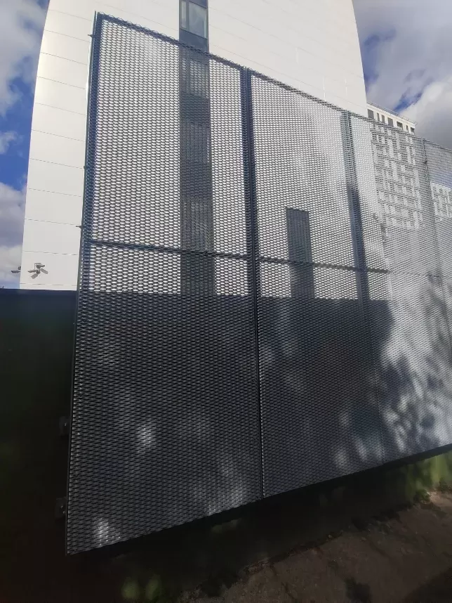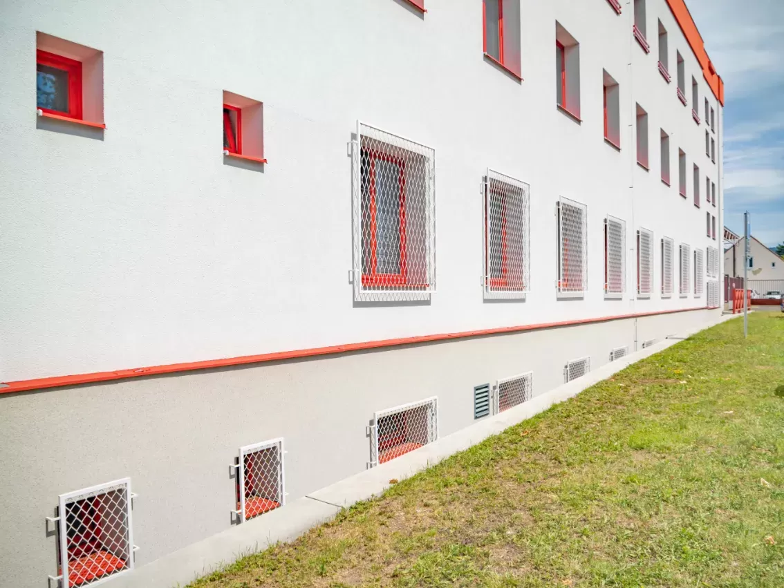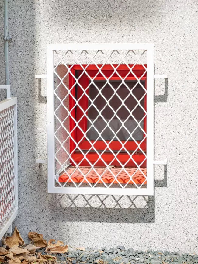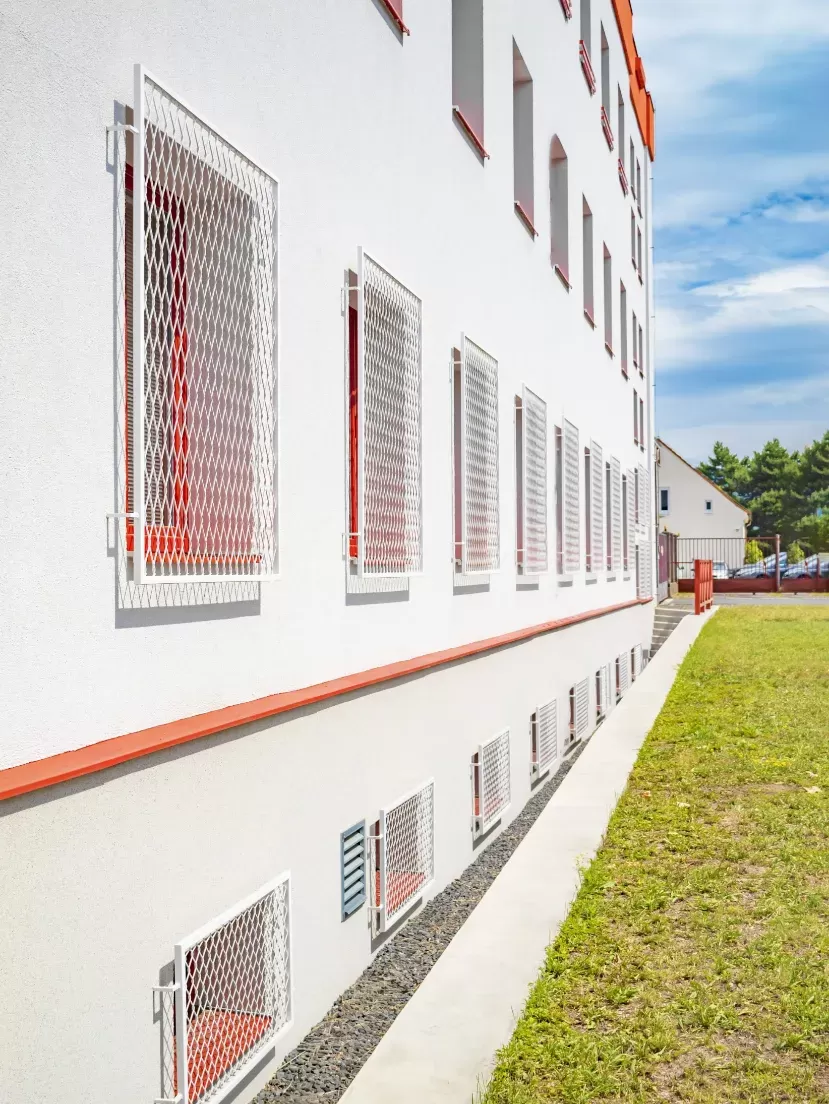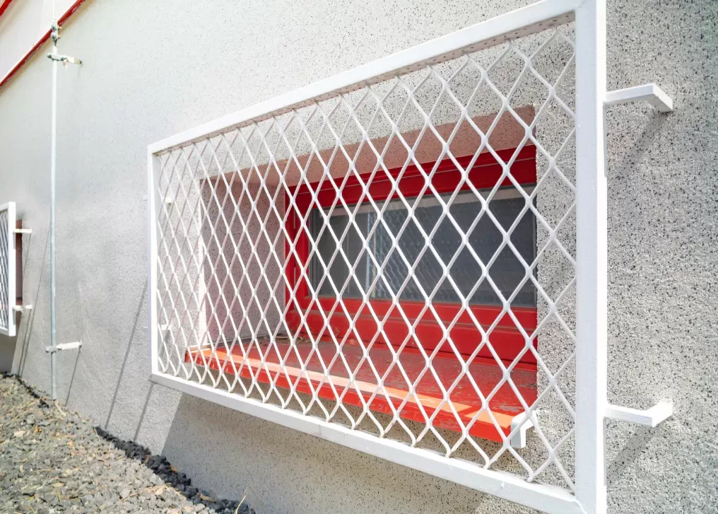 Použití: Ochranné mříže požární stanice | Typ: Tahokov oko kosočtvercové 200x80 mm / můstek 6mm + Tahokov oko kosočtvercové 100x65 mm / můstek 6 mm | Materiál: Ocel 4,0mm | Povrchová úprava: Žárové zinkování a prášková barva