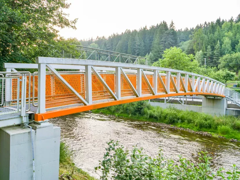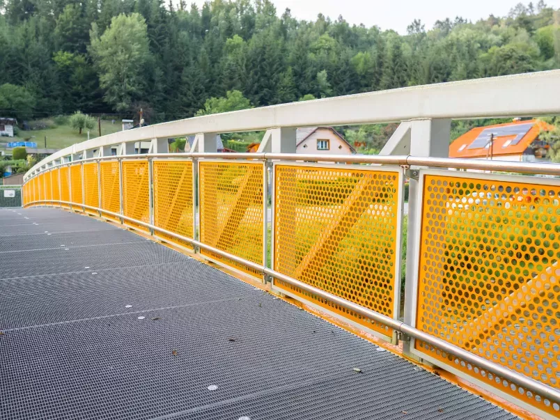 Použití: Lávka z děrovaného plechu a svařovaných sítí | Typ: Děrovaný plech Rv 30-40 + Svařovaná síť oko 50x50 mm / drát 3,0 mm | Materiál: Ocel/plech 2,0 mm + ocel / drát 3,0 mm