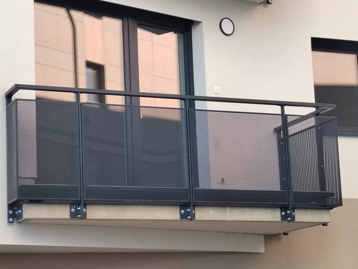 Použití: Balkonové výplně | Typ: Děrovaný plech Rv 10-15 | Materiál: Pozinkovaný plech 1,5mm | Povrchová úprava: Práškové lakování RAL 7016