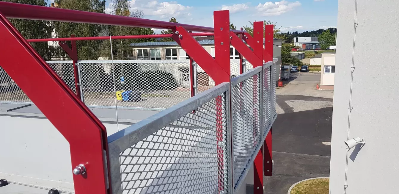 Použití: Zábradlí z tahokovu a lemovacího profilu | Typ: Tahokov oko kosočtvercové 62,5 x 25 mm / můstek 3 mm + Lemovací profil WG40 | Materiál: Ocel plech 3,0 mm + profil 2,0 mm | Povrchová úprava: Žárové zinkování + prášková barva světle šedá
